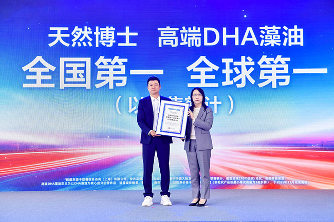 天然博士取得的荣誉不止于此。全球领先市场调研公司欧睿信息咨询(上海)有限公司中国区总经理穆愔在发布上发布市场地位声明,天然博士凭借卓越的产品力和市场影响力,荣膺“高端DHA藻油销售额全球第一”2。此前,天然博士已经连续四年荣获“高端DHA藻油凝胶糖果全国销售额第一”3,从“全国第一”到“全球第一”的跨越式增长,不仅进一步夯实天然博士在高端DHA藻油领域的领军优势,彰显品牌实力的跃升,更印证了消费者对其产品品质及品牌价值的高度认可。
