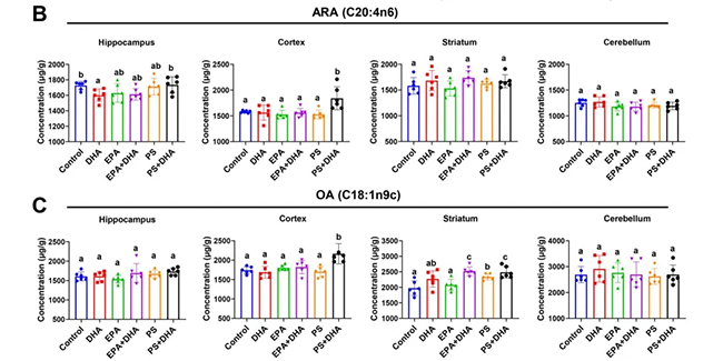 除了提升DHA,“PS+DHA”组合还提升了大脑内其他有益脂肪酸的水平,如花生四烯酸(ARA)和油酸(OA),且未引发炎症反应。