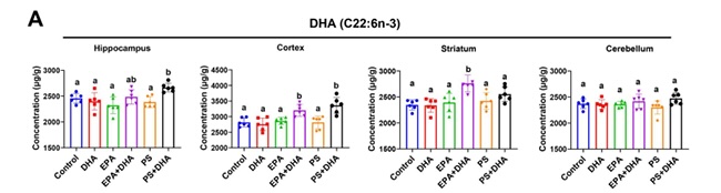 结果显示,PS作为载体,能引导DHA特异性富集于学习记忆的关键脑区——海马体与大脑皮层,而对纹状体、小脑等其他区域无显著影响,实现DHA的精准递送。从机制上看,补充PS能够显著上调DHA血脑屏障关键转运蛋白 MFSD2A 在脑血管中的基因和蛋白表达,从而促进DHA向特定脑区的转运。