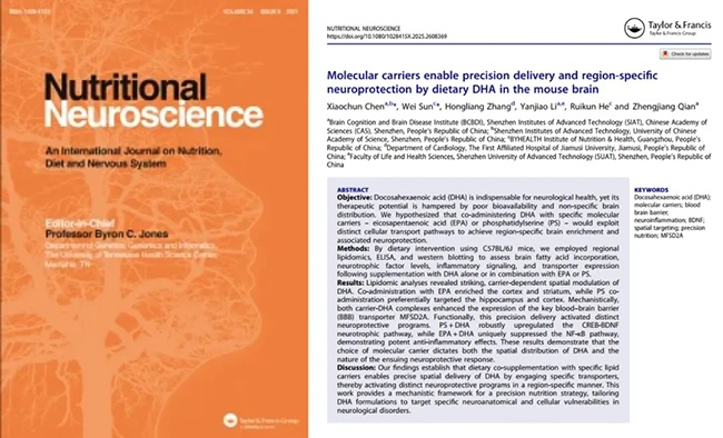 近日,天然博士联合中国科学院深圳先进技术研究院脑认知与脑疾病研究所(BCBDI)于国际期刊 Nutritional Neuroscience 上发表最新研究成果。