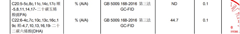 我国国家粮食局 2015 年发布的藻油行业标准规定:DHA≥35%,EPA≤3%;而欧盟要求藻油的DHA 纯度要≥32%。经SGS验证,天然博士DHA藻油的DHA纯度高达44.7%,比宣称的40%还要高,远超藻油国家以及国际标准。