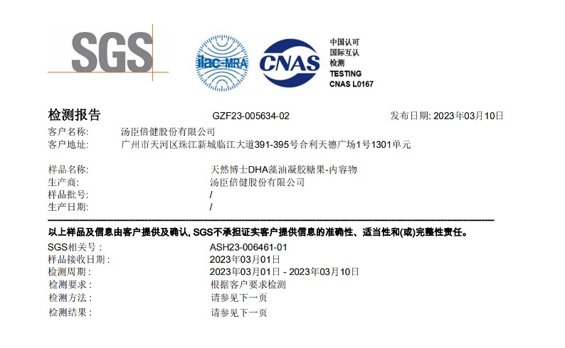 毋容置疑,天然博士DHA藻油凭借优秀的产品力,远超行业标准,顺利通过SGS的全部检测项目,获得SGS的专业检测认证。